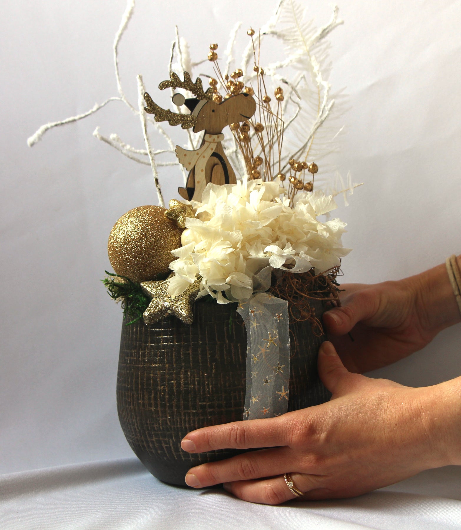 Cette composition Cerf de Noël en fleurs et feuillages stabilisés apporte une touche de charme et de poésie à votre décoration hivernale.