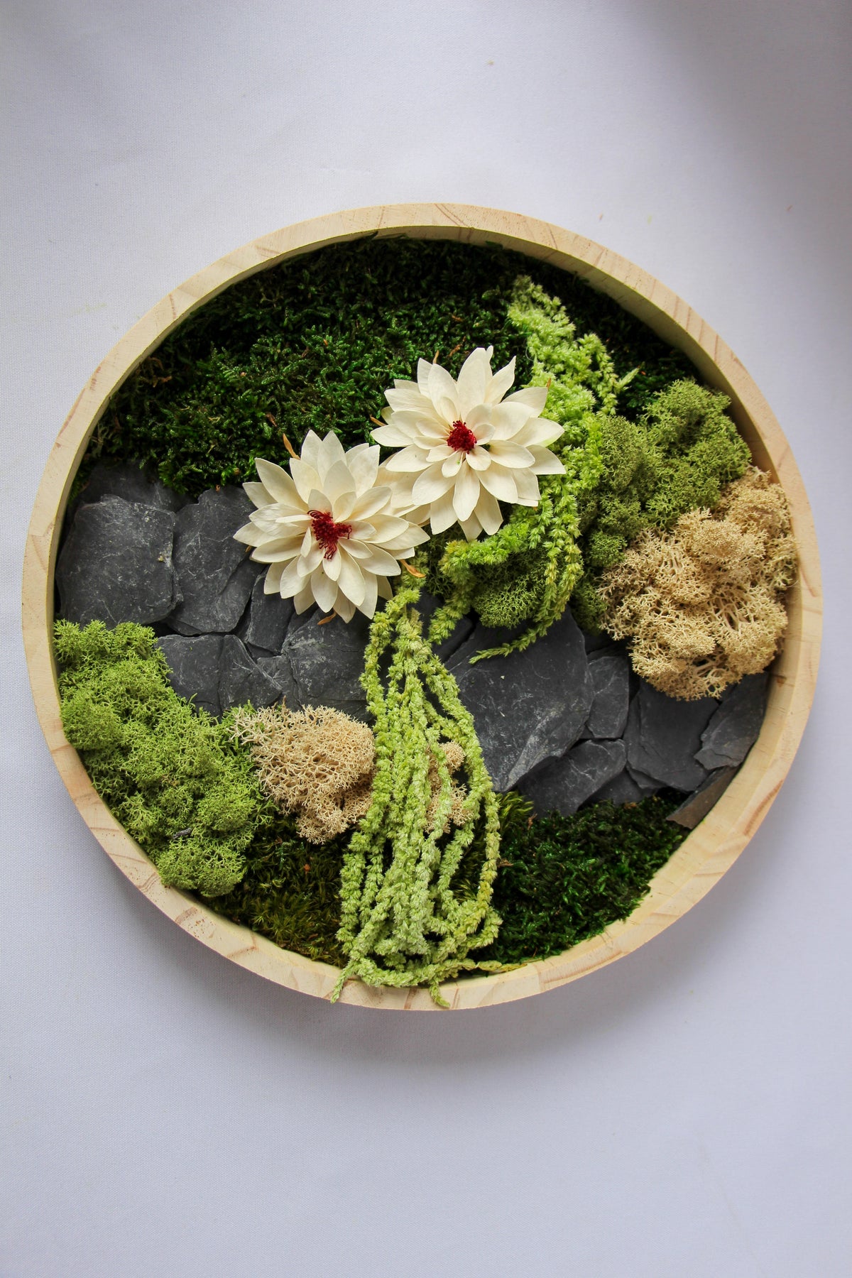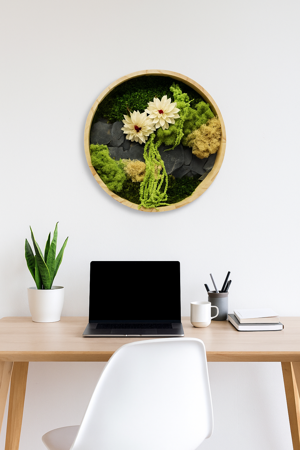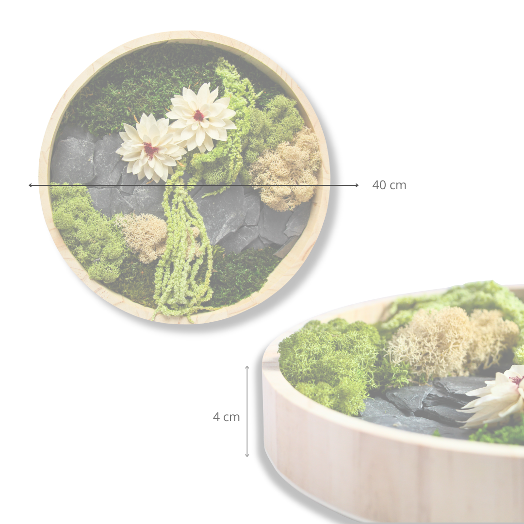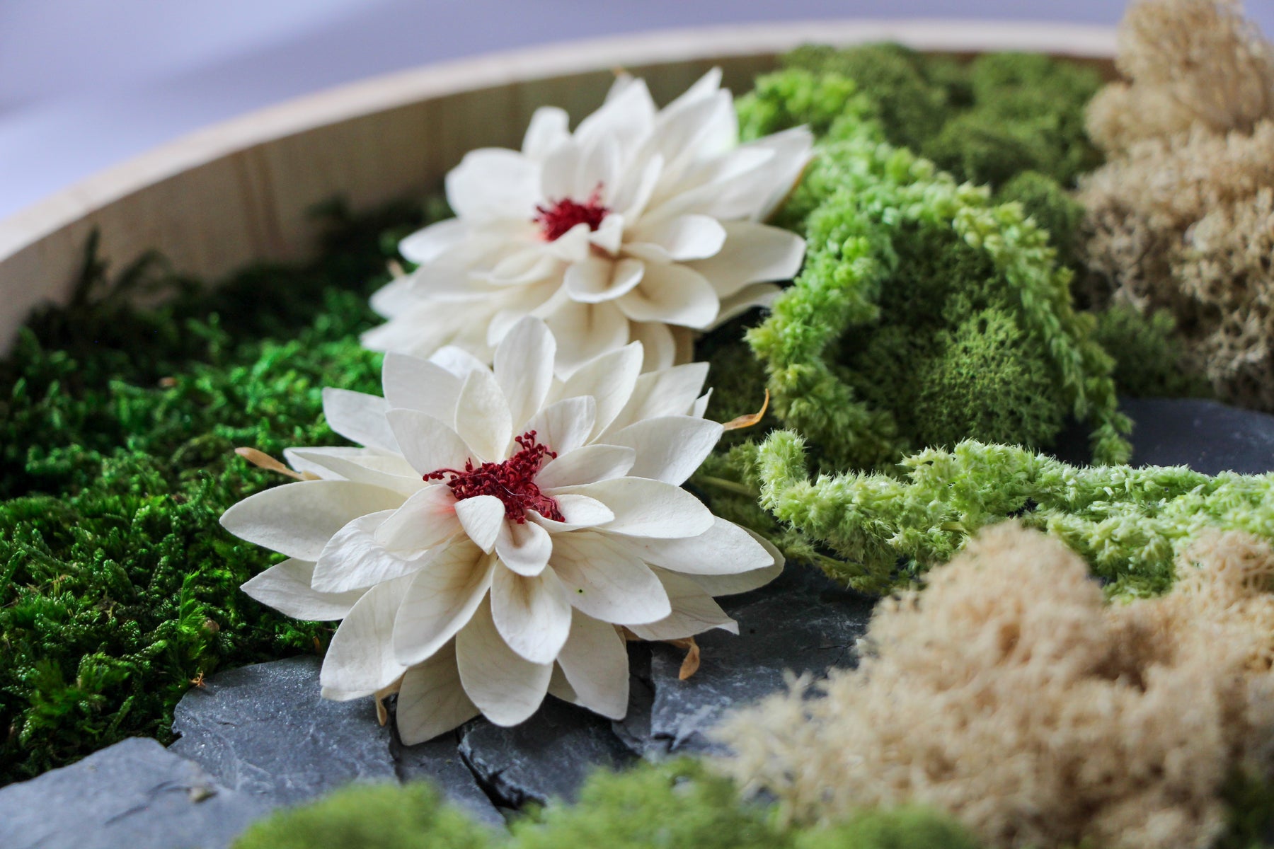 Tableau rond en bois avec dahlias blancs et végétaux stabilisés