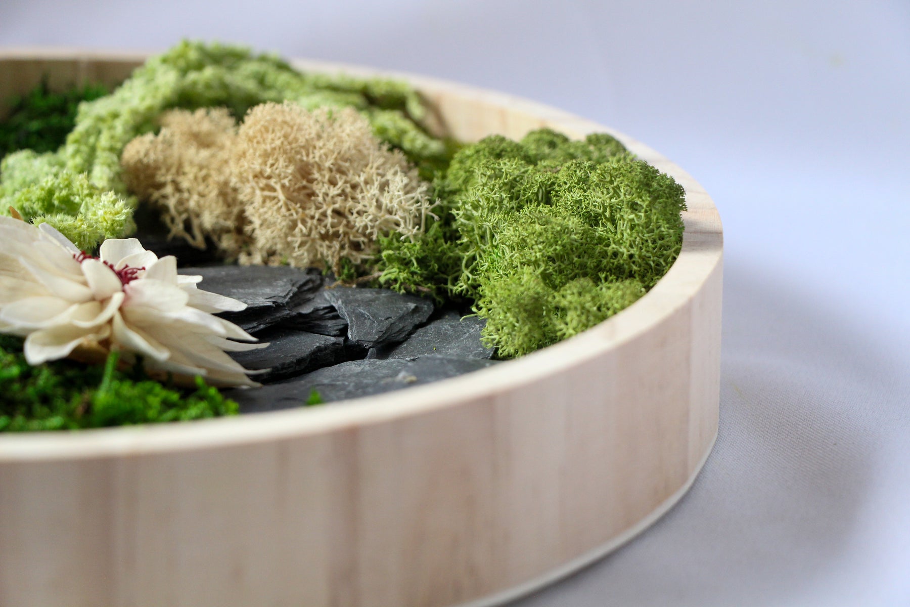 Il associe la finesse des dahlias blancs stabilisés à la richesse du végétal (mousse plate, lichen, amaranthe) et au contraste minéral de l’ardoise.