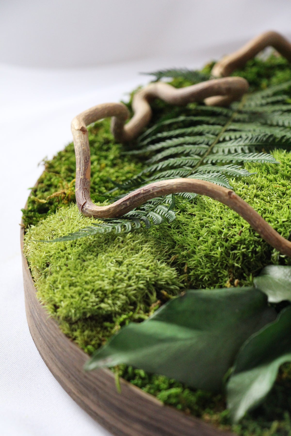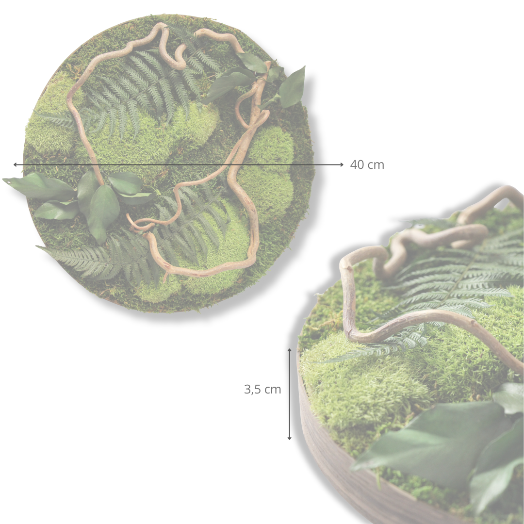 Il associe la douceur de la mousse plate et de la mousse boule à la légèreté de la fougère, l’élégance du lierre et le caractère du branchage tortueux.